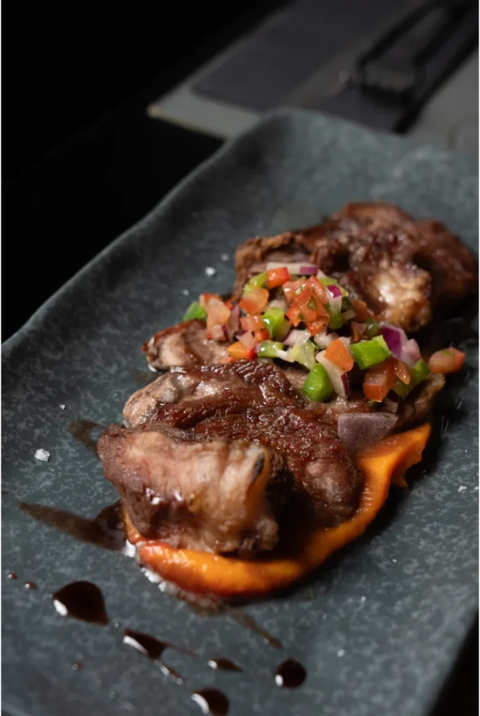 guisado y desmenuzado con cremoso de patatas trufado